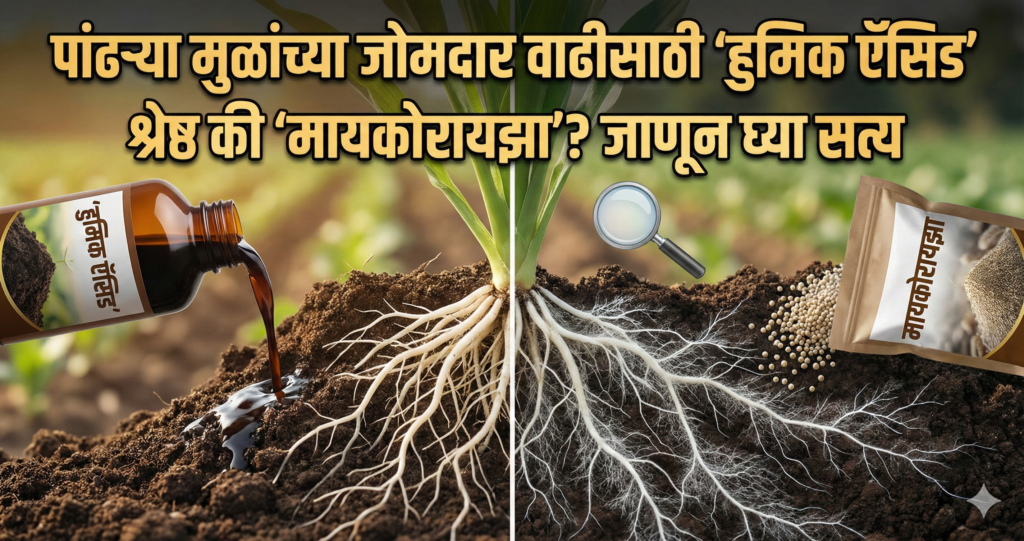 पिकांची वाढ खुंटली की आपण तातडीने खते देतो, पण ती खते शोषून घेणारी पांढरी मुळी (White Root) सक्षम आहे का? हा प्रश्न आपण कधी स्वतःला विचारला आहे का? अनेक शेतकरी बांधव पिकांच्या जोमदार वाढीसाठी प्रयत्न करतात, परंतु मुळांच्या विकासासाठी नक्की काय वापरावे—हुमिक ऍसिड की मायकोरायझा—याबाबत प्रचंड गोंधळ असतो. काही तज्ज्ञ एक घटक सुचवतात तर काही दुसरे. या लेखामध्ये आपण या दोन्ही घटकांमधील नेमका तांत्रिक फरक, त्यांचे कार्य आणि तुमच्या पिकाच्या शाश्वत फायद्यासाठी त्यांचा अचूक वापर कसा करावा, याची संपूर्ण माहिती घेणार आहोत.