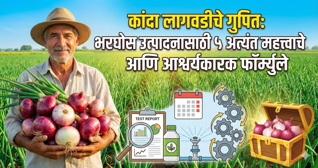 नमस्कार शेतकरी मित्रांनो, यंदाचा हंगाम कांदा उत्पादकांसाठी अत्यंत आव्हानात्मक आहे. सलग सहा महिने चाललेल्या पावसामुळे आपल्या जमिनींचे मोठे नुकसान झाले आहे. जमिनीतील कस आणि पिकासाठी आवश्यक असलेली १६ अन्नद्रव्ये पावसासोबत वाहून गेली आहेत. अशा परिस्थितीत केवळ जुन्या पद्धतीवर अवलंबून न राहता, आपल्याला विज्ञानाची आणि अनुभवाची जोड द्यावी लागेल. कांदा पिकात विक्रमी उत्पादन घ्यायचे असेल, तर हे ५ “सीक्रेट फॉर्म्युले” नीट समजून घ्या.